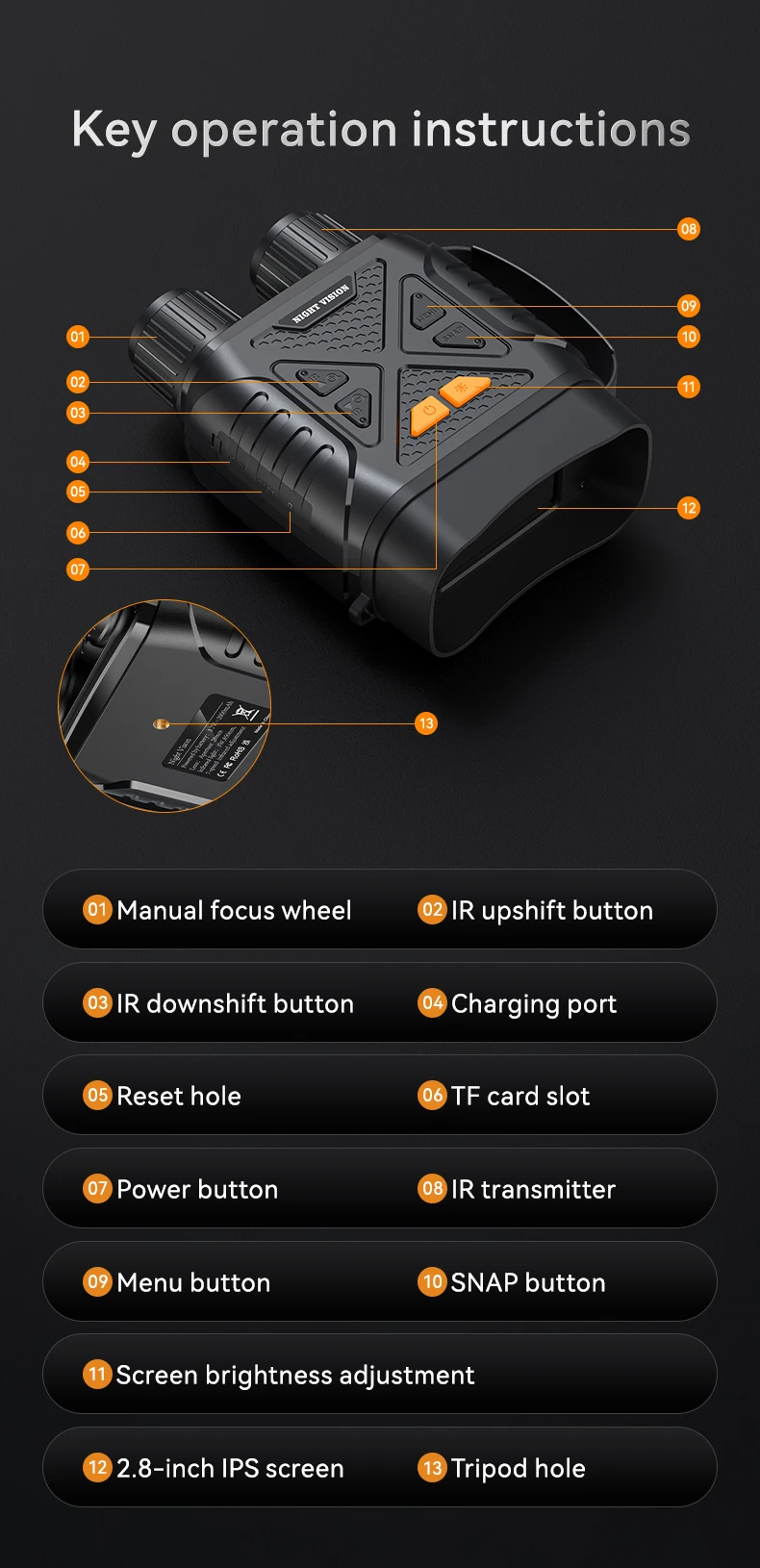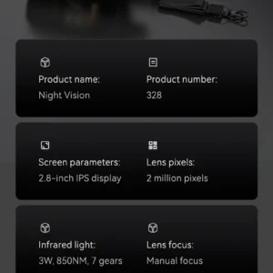 Featuring a 2.8″ IPS display, 10X digital zoom, and 3W 850nm IR lighting with 7-level adjustment, it captures vivid images and videos up to 800 meters away in full darkness. With support for photo, video, and playback modes, plus built-in 32MB memory (expandable via TF card up to 128GB), you’ll never miss a moment.